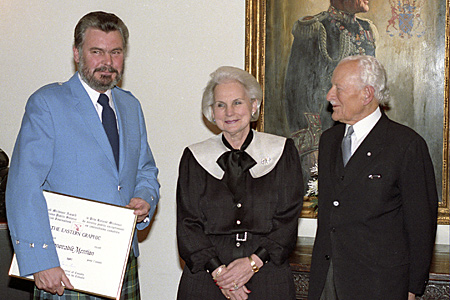 Ottawa, December 8, 1988. CBC-TV and Southam News were recipients of the 1987 Michener trophy. Governor General Jeanne Sauvé presented the awards during a ceremony held at Rideau Hall in Ottawa. The winners were selected from among 6 finalists in the competition.