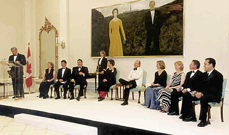 Pierre Bergeron, far left, President of the Michener Awards Foundation, introduces the finalists of the 2000 Michener Award who are seated with their Excellencies at Rideau Hall, May 24, 2001.